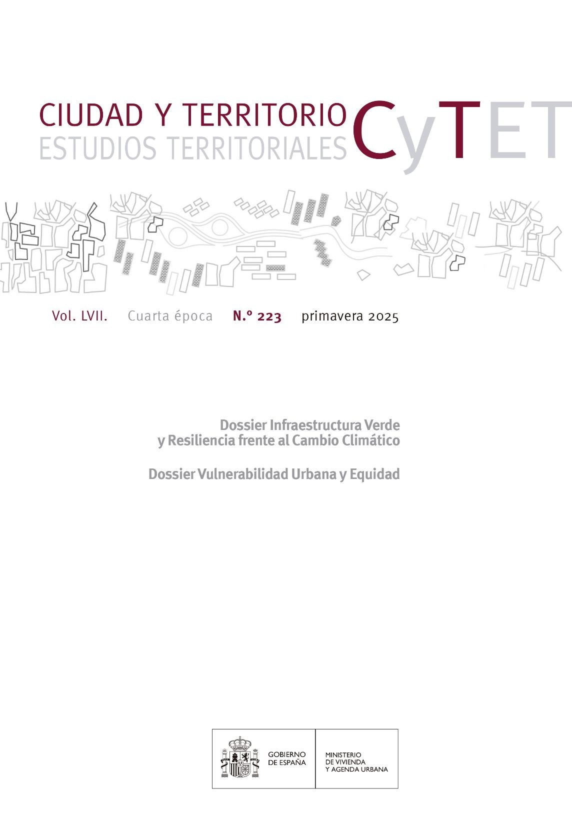 Publicación periódica trimestral de consolidada referencia en el campo de la planificación urbanística y territorial y de estudios urbanos y territoriales en general; incluye la dimensión jurídica, económica y sociopolítica de la planificación y y ordenación del territorio. CyTET n.º 223, primavera 2025 - Monográfico: Dossier Infraestructura Verde y Resiliencia frente al Cambio Climático & Dossier Vulnerabilidad Urbana y Equidad - Cuarta época. Volumen LVII. _________ Depósito Legal: M-10422-1970
